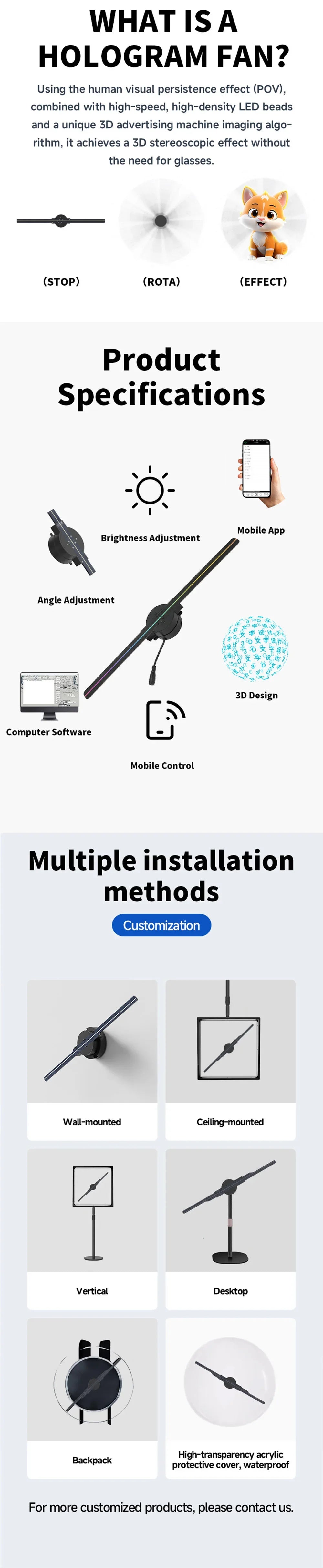 Using the human visual persistence effect (Pov),combined withhigh-speed,high-density LED beads and a unique 3D advertising machine imaging algo- rithm,it achievesa3D stereoscopic effect without the need for glasses.